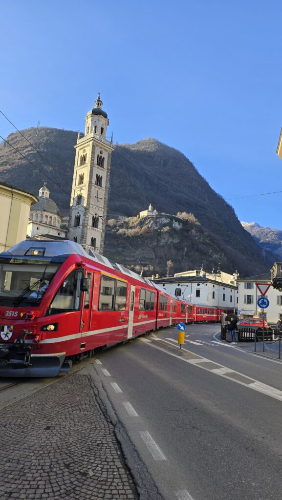 Il punto di partenza del Trenino Rosso del Bernina è Tirano, elegante cittadina lombarda caratterizzata da palazzetti liberty e da una splendida basilica mariana: il Santuario della Madonna di Tirano.